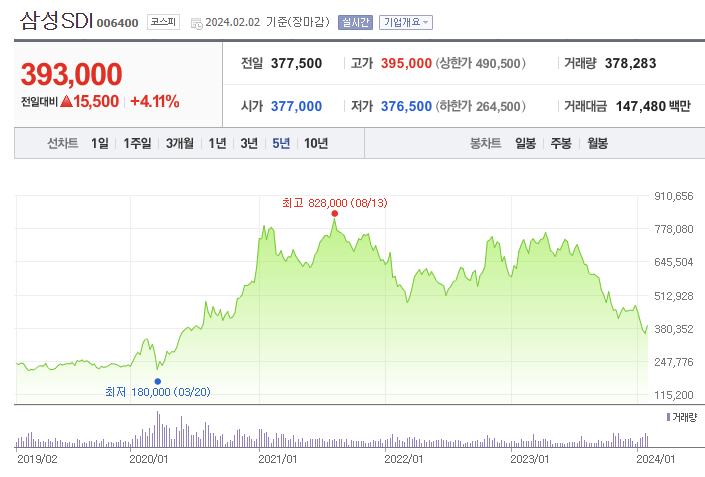 삼성SDI 주가 (출처 : 네이버 증권)