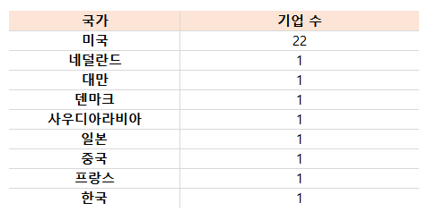 30위권 내에 미국 기업이 22개로 압도적 1위를 달리고 있습니다. 미국 외에 다른 국가들은 모두 1개씩만 포함되어 있는 걸 보면, 미국이 얼마나 엄청난 국가인지 알 수 있습니다. 미국 외에 네덜란드, 대만, 덴마크, 사우디, 일본, 중국, 프랑스, 그리고 한국 기업이 각각 1개씩 포함되어 있습니다.