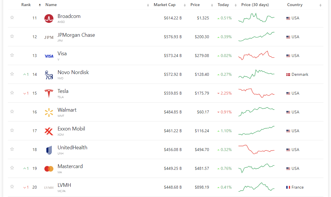11~20위 역시 대다수가 미국 기업입니다. 미국 기업이 8개 포함되어 있으며, 그 외 Novo Nordisk(덴마크)와 최고의 럭셔리 기업인 LVMH(프랑스)가 20위권 내에 포함되었습니다. 서학개미들이 가장 사랑하는 기업인 테슬라는 최근 주가가 급락하여 현재 세계 시가총액 순위 15위를 기록하고 있습니다.