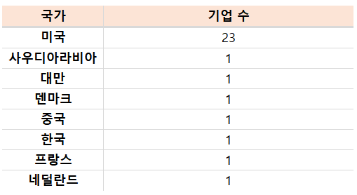 30위권 내에 미국 기업이 23개로 압도적 1위를 달리고 있습니다. 미국 외에 다른 국가들은 모두 1개씩만 포함되어 있는 걸 보면, 미국이 얼마나 엄청난 국가인지 알 수 있습니다. 미국 외에 사우디아라비아, 대만, 덴마크, 중국, 한국, 프랑스, 네덜란드 기업이 한 개씩 포함되어 있습니다.