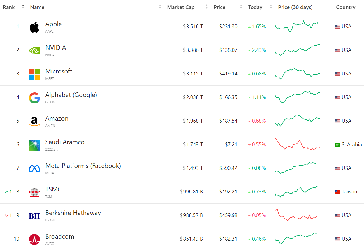 세계 기업 시가총액 1위는 Apple입니다. 이전에는 AI 열풍에 힘입어 Microsoft가 1위였던 적도 있지만, 최근 Apple이 다시 한 번 시가총액 1위를 탈환하였습니다. 1~10위 중, 8개는 미국 기업이며, 그 외 Saudi Aramco (사우디 아라비아)와 TSMC(대만)이 각각 6위와 8위를 기록하며, 10위권 내에 이름을 올렸습니다. 시가총액 상위권은 대부분 IT 기업들이 차지하고 있습니다.