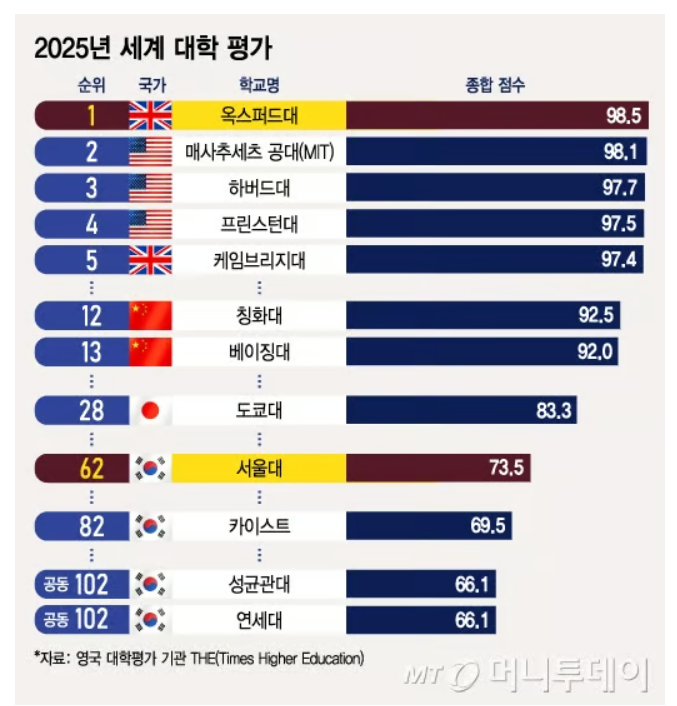 지난 10월 9일, 영국의 글로벌 대학평가 기관인 THE (Times Higher Education)은 '2025년 세계 대학 평가' 순위를 발표했습니다. 과연 전 세계 1위 대학은 어디이고, 한국의 주요 대학들은 몇 위를 차지했을지 확인해 보겠습니다.