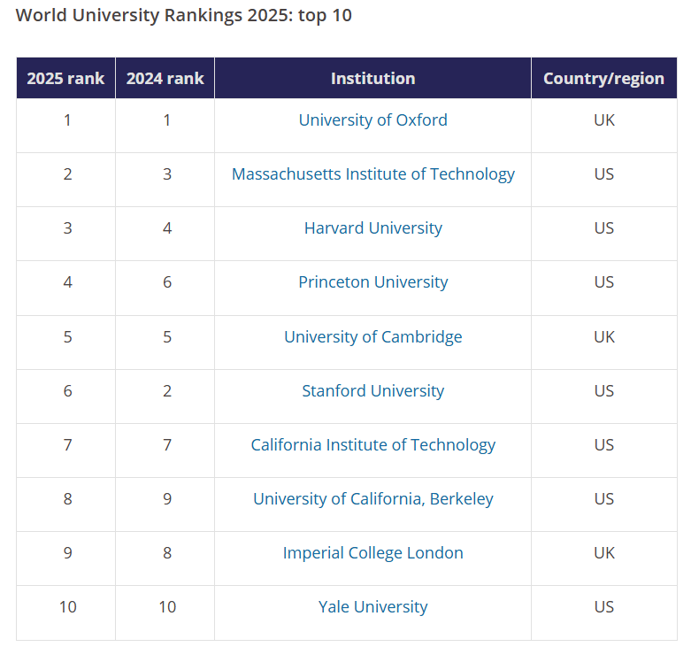 이번 2025 세계 대학 평가에서 TOP 10을 차지한 대학을 먼저 살펴 보겠습니다.
