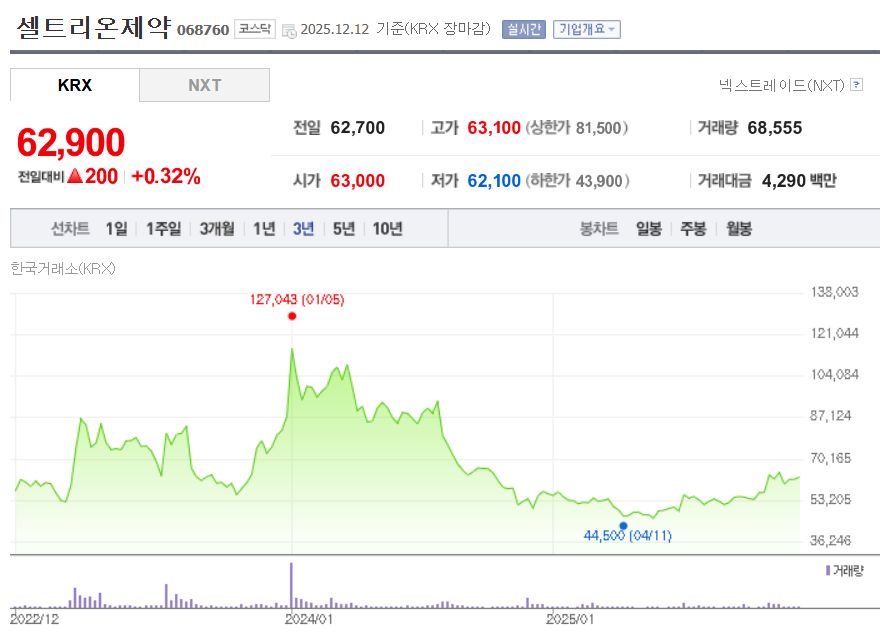 셀트리온제약의 최근 주가는 약 7만 원대 초반에서 거래되고 있으며, 지난 1년 동안 약 4만 원대 중반에서 8만 원대 후반 사이의 변동폭을 보였습니다. 전문의약품을 중심으로 한 안정적인 매출 구조와 셀트리온 그룹 내 시너지에 대한 기대감이 주가의 주요 배경으로 작용하고 있습니다. 다만 PER과 PBR 등 밸류에이션 지표는 제약 업종 평균 대비 높은 편에 속해, 실적 성장에 대한 기대가 이미 상당 부분 반영되어 있다는 평가도 존재합니다. 배당수익률은 높지 않아 배당보다는 성장성과 실적 개선 가능성에 초점을 둔 투자 성격이 강합니다. 또한 의약품 허가, 약가 정책 변화, 경쟁 심화 등 제약업 특유의 규제 및 시장 환경 변화에 따라 주가 변동성이 커질 수 있다는 점은 리스크 요인입니다. 전반적으로 셀트리온제약은 그룹 시너지와 중장기 성장 기대를 갖춘 종목이지만, 높은 밸류에이션과 업종 특유의 불확실성도 함께 고려해야 하는 기업입니다.
