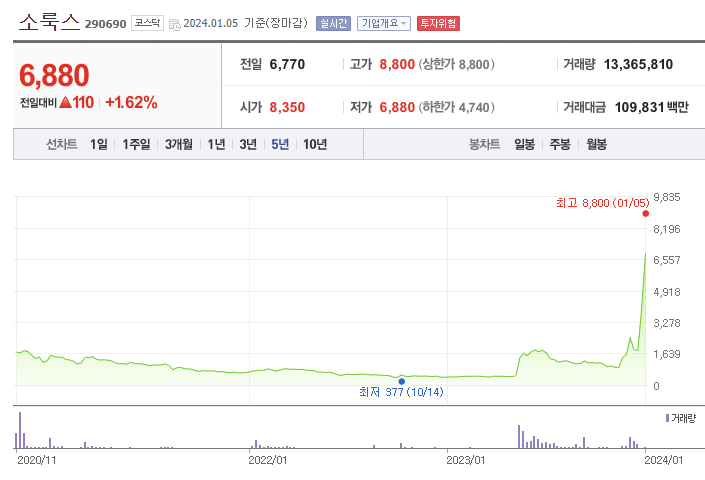 소룩스는 글로벌 LED 조명 솔루션 기업으로, 지난 2020년 11월 코스닥 시장에 상장했습니다. 이후 주가는 특별한 재료 없이 지속 하향 곡선을 그려 왔으나, 지난 '23년 12월 7일 무상증자를 결정하였습니다. 무상증자 권리락일인 12월 26일부터 5거래일 연속 상한가를 기록하며 현재 주가는 6,880원 수준까지 올라왔습니다. 다만, 무상증자는 기업 가치가 높아지는 것이 아니기 때문에 단기 급등한 주가가 다시 하락할 수 있어 조심스럽게 접근하셔야 할 것으로 보입니다.