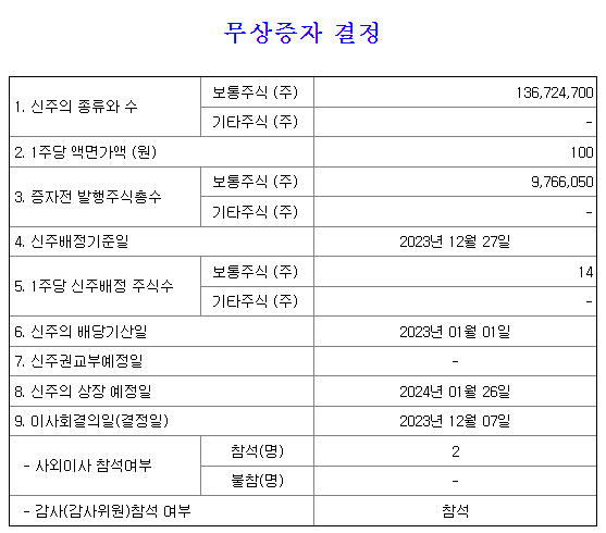 - 무상증자 기준일 : 12월 27일