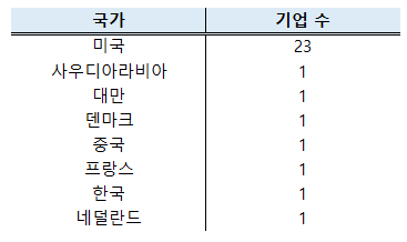 30위권 내에 미국 기업이 23개로 압도적 1위를 달리고 있습니다. 미국 외에 다른 국가들은 모두 1개씩만 포함되어 있는 걸 보면, 미국이 얼마나 엄청난 국가인지 알 수 있습니다. 미국 외에 사우디아라비아, 대만, 덴마크, 중국, 프랑스, 한국, 네덜란드 기업이 한 개씩 포함되어 있습니다.
