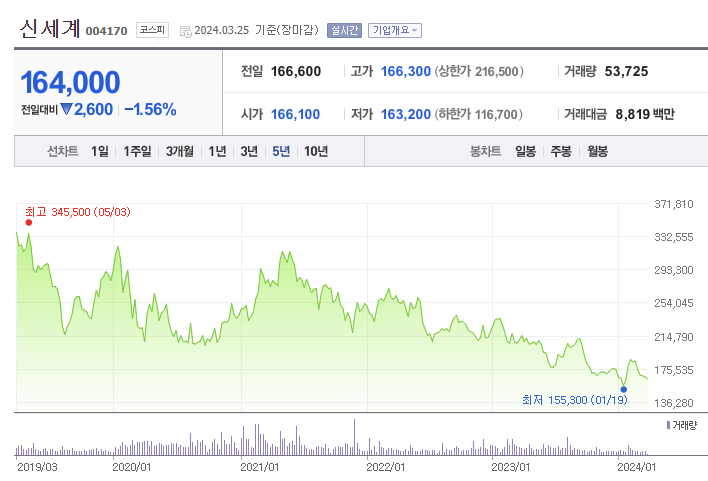 신세계의 주가는 지난 2021년부터 지속적으로 하락 추세에 있습니다. '23년은 '22년대비 실적이 하락하였고, 또한 최근 정용진 부회장이 회장에 취임하였으나, 오너리스크에 따른 신뢰를 주지 못 하며 주가는 여전히 지지부진한 모습입니다.