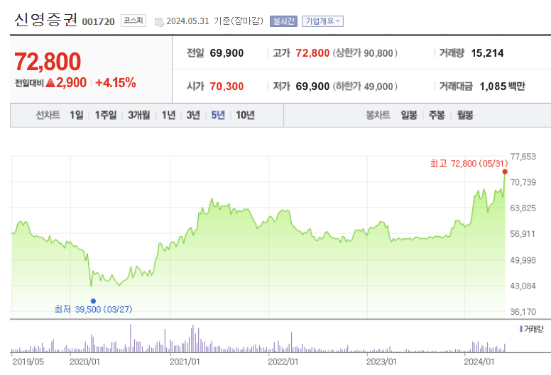 신영증권은 팬데믹 시기를 제외하면 주가가 지속적으로 보합세를 유지하고 있었으나, 최근 밸류업 프로그램이 주목 받으며 주가가 상승 기조를 보이고 있습니다.