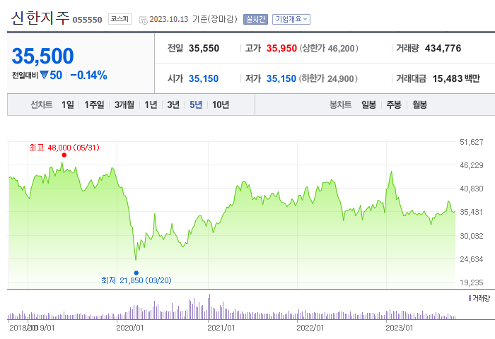 1. 신한지주 주가 지난 5년간의 신한지주 주가를 살펴보면, 타 종목 대비 큰 변동 없이 보합세를 유지하고 있습니다. 사실 그래서 주식 자체의 매력이 크지는 않지만, 배당수익률이 괜찮은 주식