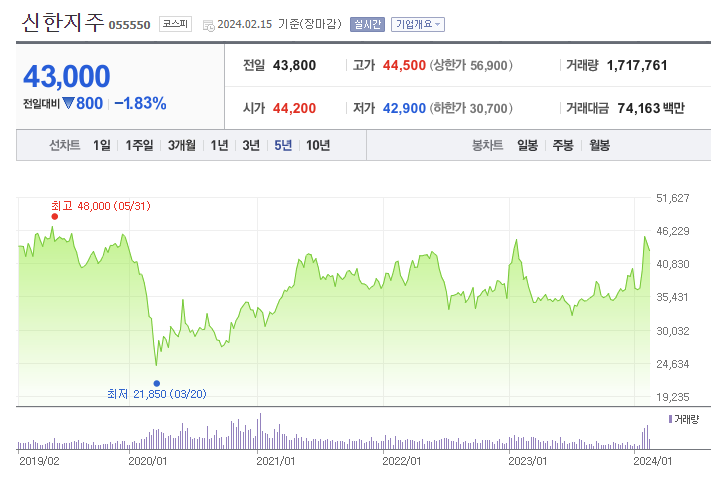 지난 5년간의 신한지주 주가를 살펴보면, 팬데믹 기간을 제외하고는 타 종목 대비 큰 변동 없이 보합세를 유지하고 있습니다. 사실 그래서 주식 자체의 매력이 크지는 않았지만, 최근 저PBR 종목들이 각광 받으면서, 신한지주도 주가도 급 상승하는 모습을 보이고 있습니다. 하지만, 저PBR주의 옥석 가리기가 시작된 만큼, 앞으로의 주가를 주목해봐야 할 것 같습니다.