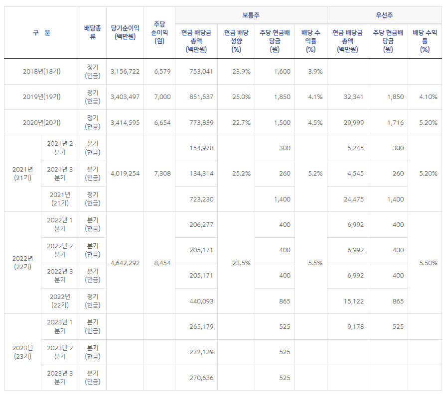 2023년 연간 배당금 (1분기, 2분기, 3분기, 결산 배당 진행)