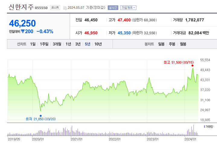 신한지주 주가 (출처 : 네이버 증권)