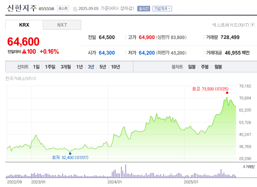 신한지주의 현재 주가는 약 64,600원이며, 지난 52주간 최고 73,500원, 최저 42,500원 사이에서 등락하며 변동성을 보여주고 있습니다. 2025년 2분기 연결 기준 당기순이익은 1조5,491억 원으로 전분기 대비 약 4.1% 증가, 상반기 누적 순이익은 3조374억 원에 달해 사상 최대 실적을 달성했습니다. 수수료 및 유가증권 관련 비이자이익이 크게 개선되며 실적 안정성을 강화했고, 이어 자사주 8,000억 원 매입·소각과 주당 570원 중간배당 발표는 투자자의 기대를 더욱 높이고 있습니다. 또한, 목표주가 95,000원과 투자의견 “Buy” 유지 등 긍정적인 애널리스트 평가들도 눈에 띕니다. 다만, 경기 둔화로 인한 대손 비용 상승과 금융업종 규제 리스크는 단기 주가 흐름에 일부 부담 요인이 될 수 있습니다.