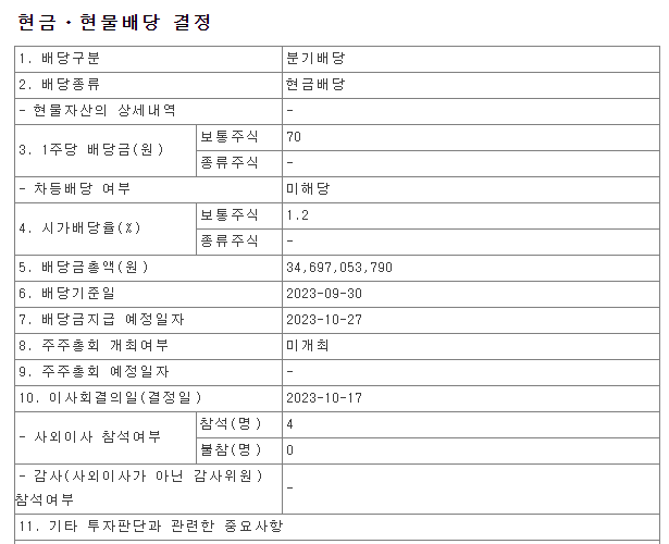 배당금 : 70원 (지난 1,2분기와 동일)