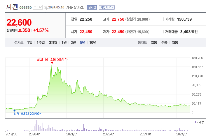씨젠은 지난 코로나 시기에 진단키트 관련주로써 최고의 수혜주 중 하나로 등극하며, 16만원까지 주가가 치솟았으나, 코로나가 지난 지금은 2만원 대의 주가를 유지하고 있습니다. 현재 실적도 오히려 코로나 이전 대비 더욱 좋은 상황이지만, 새로운 비즈니스에 따른 기대감이 없어 이 부분이 주가에 반영되어 지속 우하향 중입니다. 씨젠은 비코로나 사업을 중심으로 진단 관련 비즈니스를 진행하겠다는 생각이나, 이 부분이 어떻게 진행될지 지켜봐야겠습니다.
