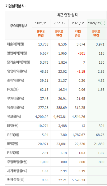 - 2024년 1분기 당기순이익 : -20억원 (적자전환)