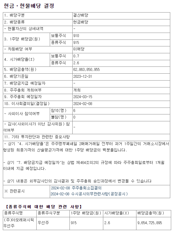 배당금 : 910원(보통주) / 915원(우선주)