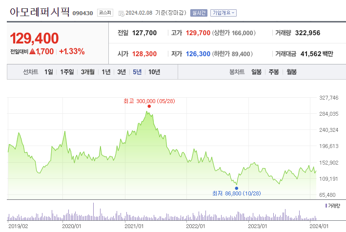 아모레퍼시픽의 주가는 지난 '21년 전고점인 30만원을 기록하였다가 이후 팬데믹 기간이 길어지고 중국 리오프닝 효과가 더디게 나타나면서 주가 회복에 어려움을 겪고 있습니다. 현재도 지속적으로 횡보하고 있는 상황으로, 향후 중국 경제 회복 등 어떤 모멘텀이 나타나기 전까지는 주가 회복에 어려움이 있을 것으로 보입니다.