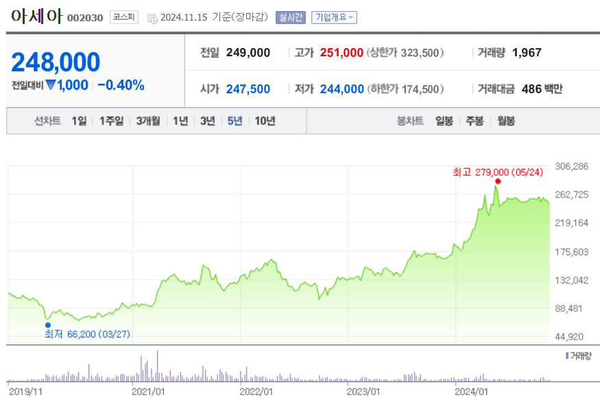 아세아는 아세아시멘트와 아세아제지 등을 자회사로 거느리고 있는 지주사이며, 제지와 시멘트 쌍끌이 호황에 힘입어 주가가 지속 상승하는 모습을 보이고 있습니다.