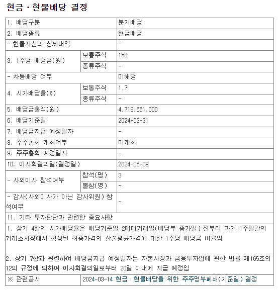배당금 : 주당 150원 (보통)