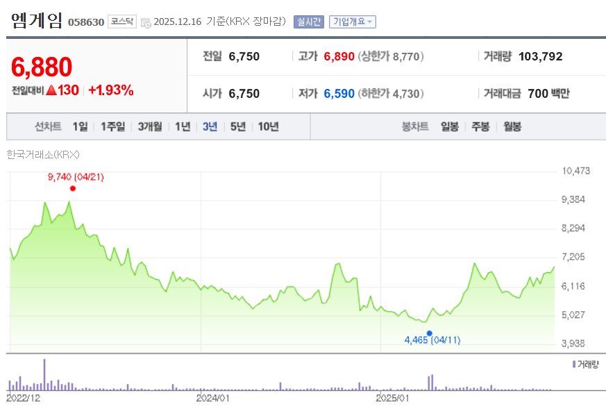 엠게임의 최근 주가는 약 7천 원대 후반에서 거래되고 있으며, 지난 1년 동안 약 5천 원대 중반에서 9천 원대 초반 사이의 변동폭을 보였습니다. 온라인 게임 퍼블리싱 및 자체 IP 기반의 안정적인 매출 구조를 바탕으로 실적 방어력이 있다는 점이 주가의 하방을 지지하는 요소로 작용하고 있습니다. 밸류에이션 측면에서는 PER과 PBR이 업종 평균 대비 낮은 편에 속해 상대적으로 저평가 매력이 있다는 평가도 나옵니다. 배당수익률은 높지 않지만, 꾸준한 현금 흐름과 비용 구조 안정성은 긍정적으로 평가됩니다. 다만 신작 출시 성과에 따라 실적과 주가가 크게 달라질 수 있고, 게임 업종 특유의 경쟁 심화와 트렌드 변화는 리스크 요인으로 작용할 수 있습니다. 전반적으로 엠게임은 안정적인 기존 사업과 저평가 요소를 갖춘 종목이지만, 성장 모멘텀 확보 여부가 중장기 주가 흐름을 좌우할 핵심 변수입니다.
