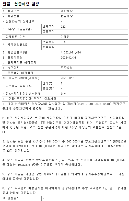 | KG이니시스 2025년 결산 배당 확정! 배당금·배당일·배당락 총정리 (1) | 2025.12.29 |