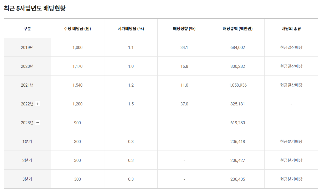 ** 아래 표에는 '23년 4분기 결산 배당은 미포함되어 있습니다.
