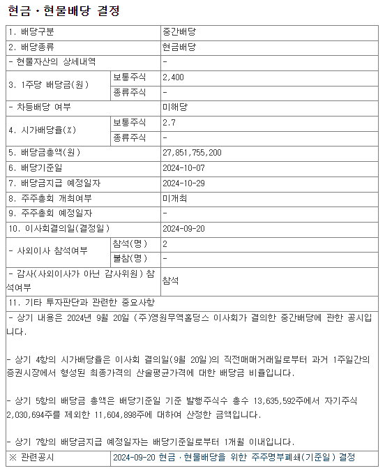 2.  2024년 영원무역홀딩스 반기배당 / 중간배당