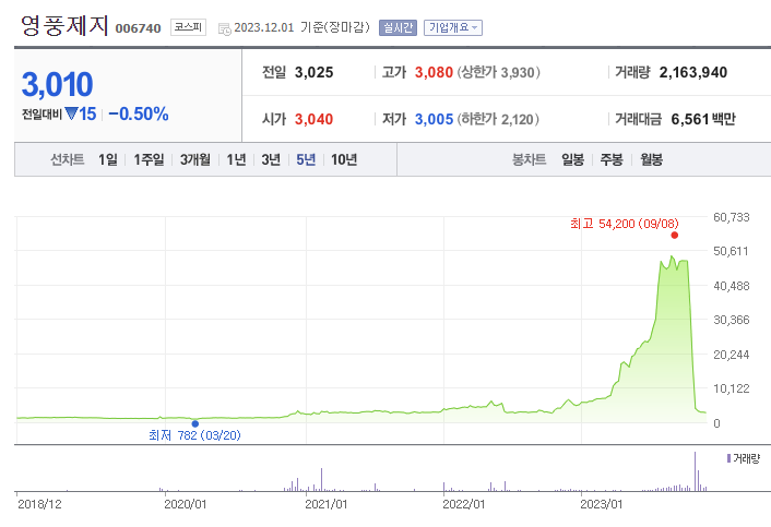 영풍제지의 주가는 잘 아시는 바와 같이, 주가 조작 사태로 인해 최대 54,200원까지 치솟았다가 거래 정지 이후 현재는 3,010원에 거래되고 있습니다. 당분간 엄청난 실적 개선이나 비전을 보여주지 않는다면, 투자에 신중을 기해야 할 것으로 보입니다. (영풍제지 주가조작 사태에 대해서는 다음 글에서 자세히 다루도록 하겠습니다)