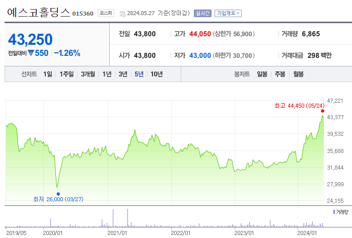 예스코홀딩스의 주가는 약보합세를 기록하다가, 지난 '23년 말부터 주가가 상승하는 모습을 보이고 있습니다. 또한, '24년에도 지속적으로 실적 개선에 따른 주가 상승이 이어지고 있습니다.