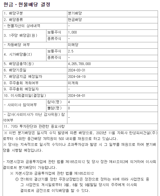2. 2024년 1분기 예스코홀딩스 배당금 (분기배당)