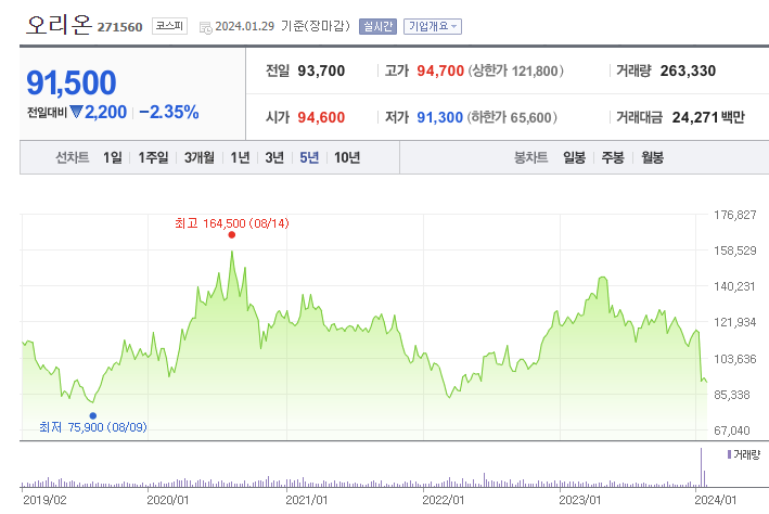 오리온 주가 (출처 : 네이버 증권)