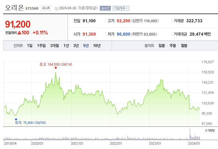 오리온의 주가는 지속적으로 부침이 있어 왔습니다. 다만, 최근 견조한 실적이 이어지고 있고, 배당성향을 늘리면서 증권가에서는 목표주가를 조금씩 높이고 있는 상황입니다.