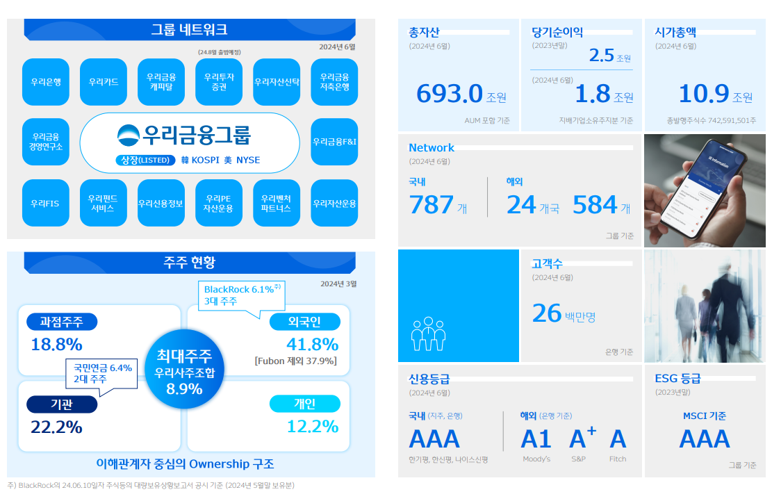 우리금융지주는 2019년 1월 설립한 지주회사로, 종속회사들의 사업은 은행업, 신용카드업, 종합금융업, 증권업 등입니다. 최대 주주는우리사주조합이며, 2대주주는 국민연금, 3대 주주는 블랙록입니다. '23년 당기순이익은 2.5조원으로 약 6% 수준입니다. '24년 상반기 순이익은 1.8조원으로, 올해는 '23년 대비 높은 수준의 순이익을 기록할 것으로 예상됩니다.