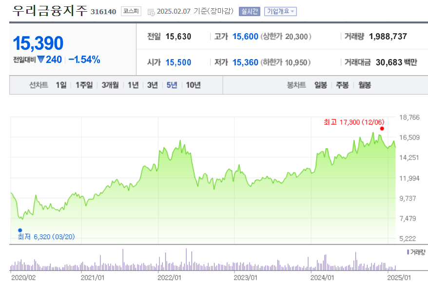 우리금융지주는 연간 1,200원의 배당을 실시하였으며, 이는 현재 주가 대비 약 7.8%의 높은 배당수익률입니다.