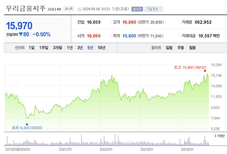 지난 5년간의 우리금융지주 주가를 살펴보면, 다른 4대 금융지주 주가와 비슷하게 큰 변동 없이 보합세를 유지하고 있습니다. 사실 그래서 주식 자체의 매력이 크지는 않지만, 배당수익률이 괜찮은 주식이라 배당 관점에서 접근하시는 편이 좋을 듯 합니다. 또한, 지난 2019년 상장 이후 반기 배당을 실시하다가, 2023년 2분기부터 분기 배당을 실시하고 있으니, 배당주로서 좀 더 매력이 커질 듯 합니다.