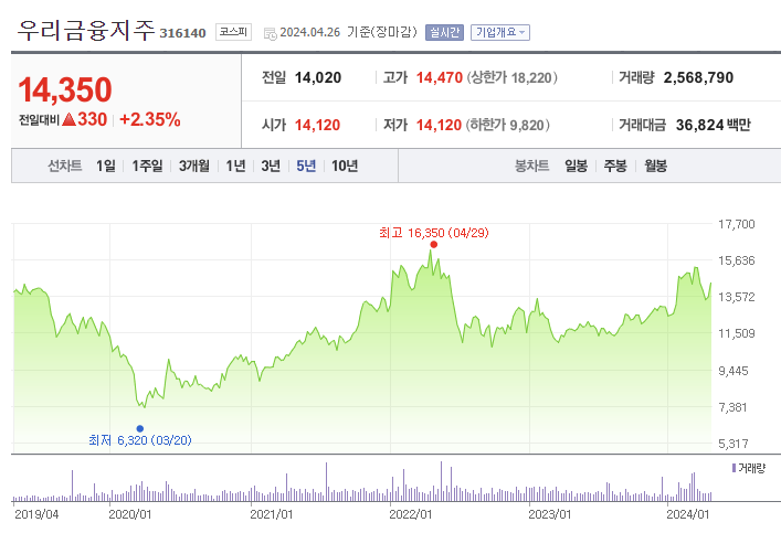 지난 5년간의 우리금융지주 주가를 살펴보면, 다른 4대 금융지주 주가와 비슷하게 큰 변동 없이 보합세를 유지하고 있습니다. 사실 그래서 주식 자체의 매력이 크지는 않지만, 배당수익률이 괜찮은 주식이라 배당 관점에서 접근하시는 편이 좋을 듯 합니다. 또한, 지난 2019년 상장 이후 반기 배당을 실시하다가, 2023년 2분기부터 분기 배당을 실시하고 있으니, 배당주로서 좀 더 매력이 커질 듯 합니다.