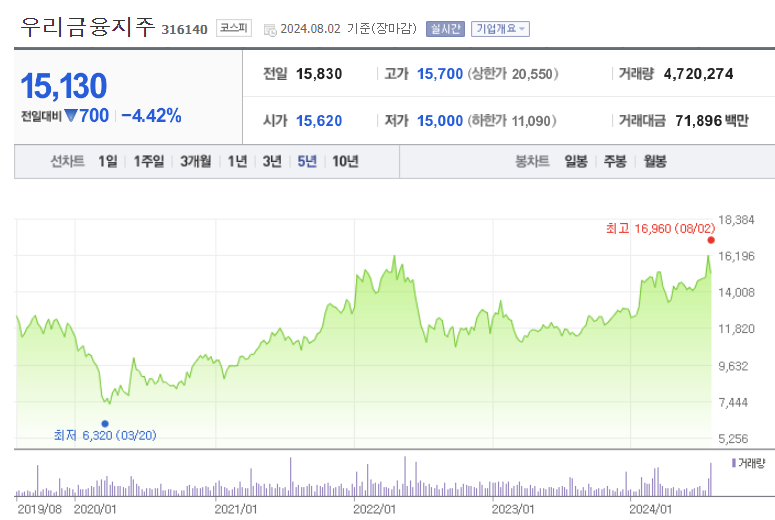지난 5년간의 우리금융지주 주가를 살펴보면, 다른 4대 금융지주 주가와 비슷하게 큰 변동 없이 보합세를 유지하고 있습니다. 사실 그래서 주식 자체의 매력이 크지는 않지만, 배당수익률이 괜찮은 주식이라 배당 관점에서 접근하시는 편이 좋을 듯 합니다. 또한, 지난 2019년 상장 이후 반기 배당을 실시하다가, 2023년 2분기부터 분기 배당을 실시하고 있으니, 배당주로서 좀 더 매력이 커질 듯 합니다.