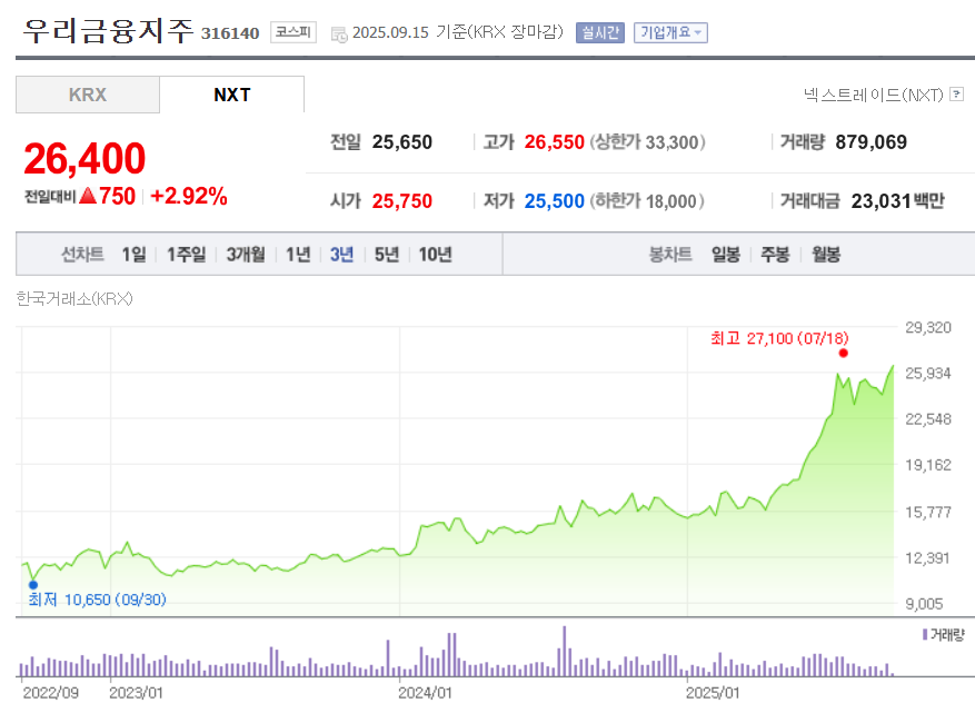 우리금융지주의 현재 주가는 약 25,650원 선에서 거래되고 있으며, 52주 최고가는 약 26,750원, 최저가는 약 15,240원 수준으로 변동성이 큰 흐름을 보이고 있습니다. 2025년 2분기 순이익은 약 9,346억 원으로, 전분기 대비 50% 이상 증가하며 실적 반등에 성공했습니다. 다만 전년 동기와 비교하면 소폭 감소한 실적으로, 비용 증가와 비은행 부문에서의 부담이 일부 영향을 준 것으로 분석됩니다. 시장에서는 낮은 PBR(0.5~0.6배대)과 안정적인 수익 기반, 자본적정성 개선 추세를 긍정적으로 평가하고 있으며, 중장기적으로는 밸류에이션 재평가 가능성이 있다는 기대가 큽니다. 다만 금리 상승, 대출 수요 둔화, 금융 규제 강화 등 외부 리스크 요인은 단기 주가 흐름에 불확실성을 높일 수 있습니다.