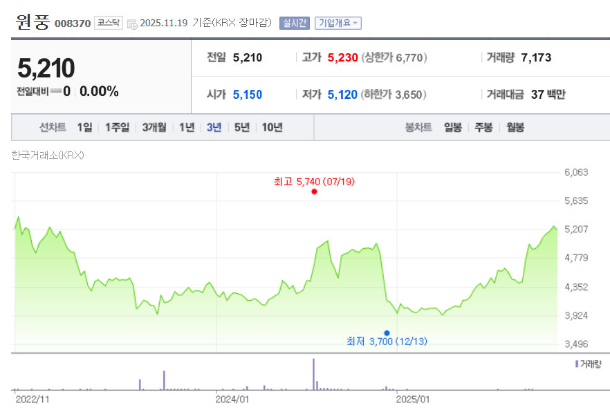 원풍의 최근 주가를 보면 현재 약 5,200원대에서 거래 중이며, 지난 1년간에는 대략 3,700원에서 5,330원 사이의 변동폭을 보였습니다. 주가수익비율(PER)은 약 8배대, 주가순자산비율(PBR)은 약 0.65배 수준으로 나타나고 있어 시장 대비 저평가된 상태로 해석되기도 합니다. 배당수익률은 약 4.8% 내외로 보통 수준을 유지하고 있어 수익-배당 관점에서도 관심을 받을 수 있는 종목입니다. 다만 이 기업은 산업용 타포린 및 광고용 원단 생산 업체로서 원자재 가격 변동, 수출시장 경쟁 심화, 해외 공급망 리스크 등에 영향을 받을 수 있다는 점에서 주가의 업황 리스크가 존재합니다. 전반적으로 원풍은 저평가 매력과 안정적인 배당을 갖추었다고 평가되지만, 산업 환경 변화에 대한 대응력과 향후 실적이 주가 흐름을 결정할 핵심 요인으로 보입니다.