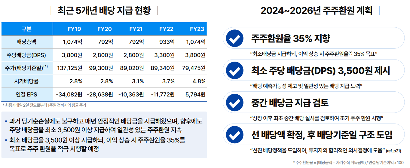 롯데쇼핑은 2024~2026년 주주환원에 대해 아래와 같이 상세한 계획을 수립하였습니다. 최소 주당 배당금을 제시하여 배다 예측 가능성을 제고하고, 이익 상승시 주주환원 확대 계획을 수립하여, 향후 주주 친화적인 정책을 지속해 나갈 것을 약속했습니다. 또한, 상장 이후 최초로 중간 배당을 신설하는 것 또한 검토 할 예정입니다.