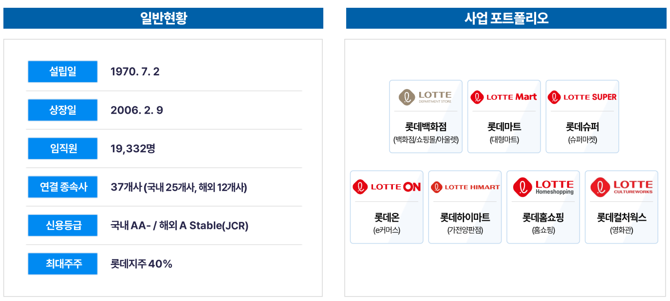 롯데쇼핑은 지난 1970년에 설립되어, 2006년 코스피에 상장 하였습니다. 사업은 현재 백화점, 할인점, 슈퍼, 전자제품, 영화관 등의 사업을전개하고 있습니다. 이 중 할인점, 백화점, 전자제품 사업이 롯데쇼핑의 매출을 이끄는 Top3 사업입니다.