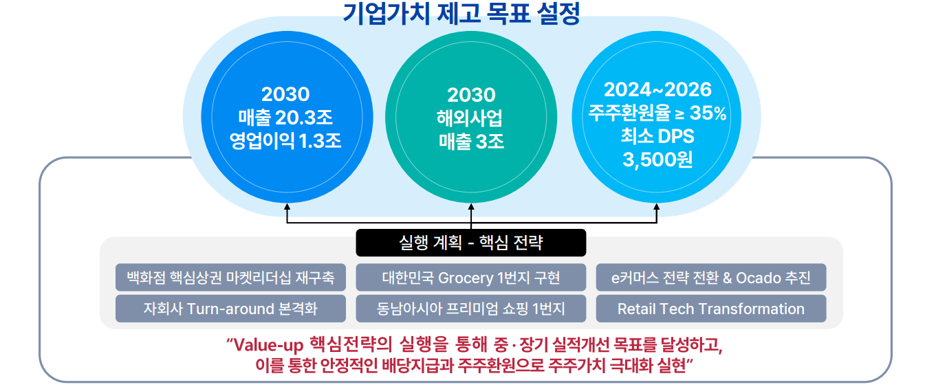 롯데쇼핑은 2030년까지 매출 20.3조, 영업이익 1.3조의 중장기 목표를 수립하였습니다. '23년 매출이 약 14조원, 영업이익이 5000억원 수준인 것으로 미루어 볼 때, 상당히 공격적인 목표를 수립한 것이라 볼 수 있습니다. 또한, 2024~2026년 기간에 주주환원율을 최소 35%로 설정하고, 최소 주당 배당금 목표를 3,500원으로 잡았습니다.