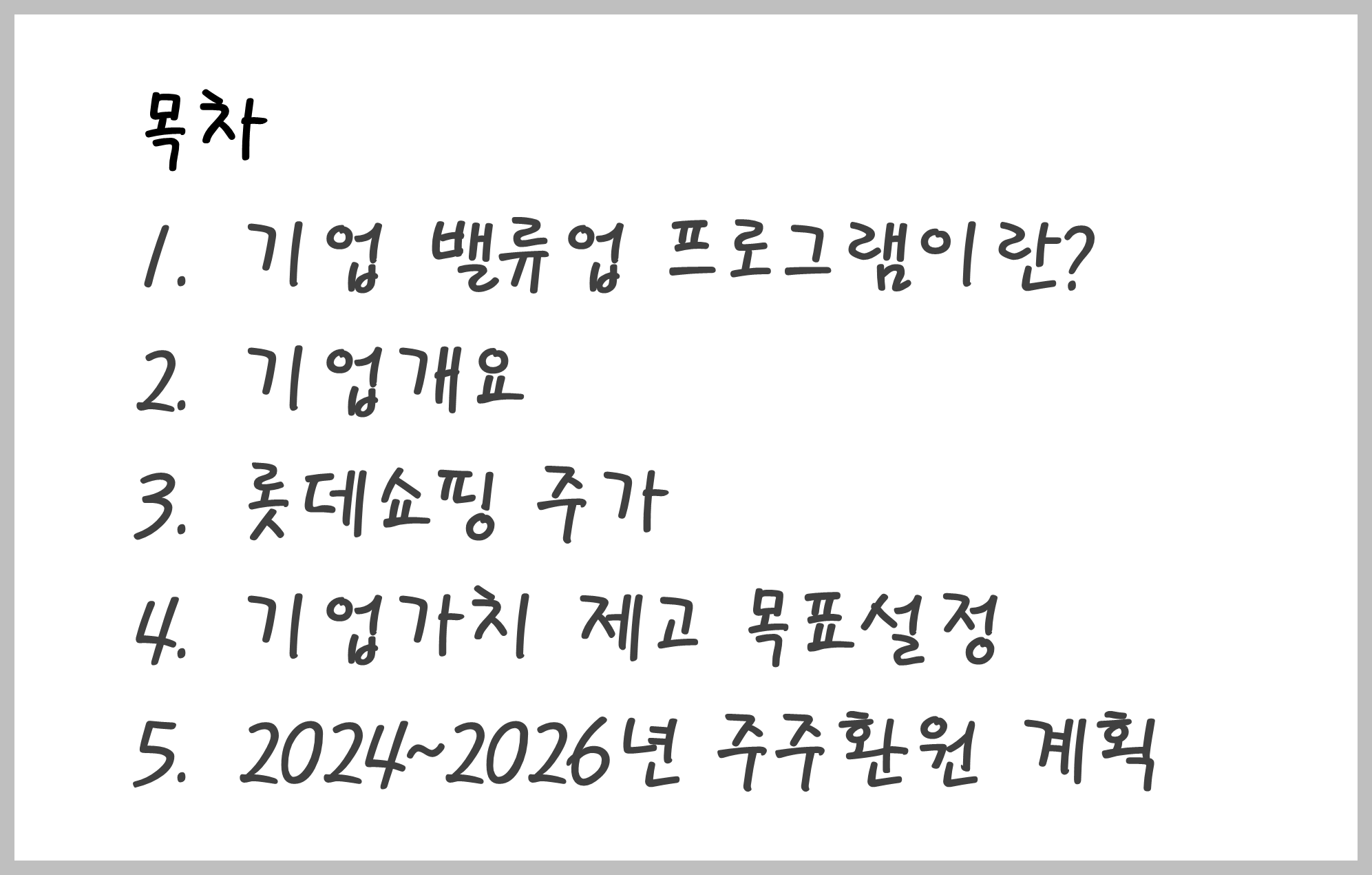롯데쇼핑은 2024~2026년 주주환원에 대해 아래와 같이 상세한 계획을 수립하였습니다. 최소 주당 배당금을 제시하여 배다 예측 가능성을 제고하고, 이익 상승시 주주환원 확대 계획을 수립하여, 향후 주주 친화적인 정책을 지속해 나갈 것을 약속했습니다. 또한, 상장 이후 최초로 중간 배당을 신설하는 것 또한 검토 할 예정입니다.