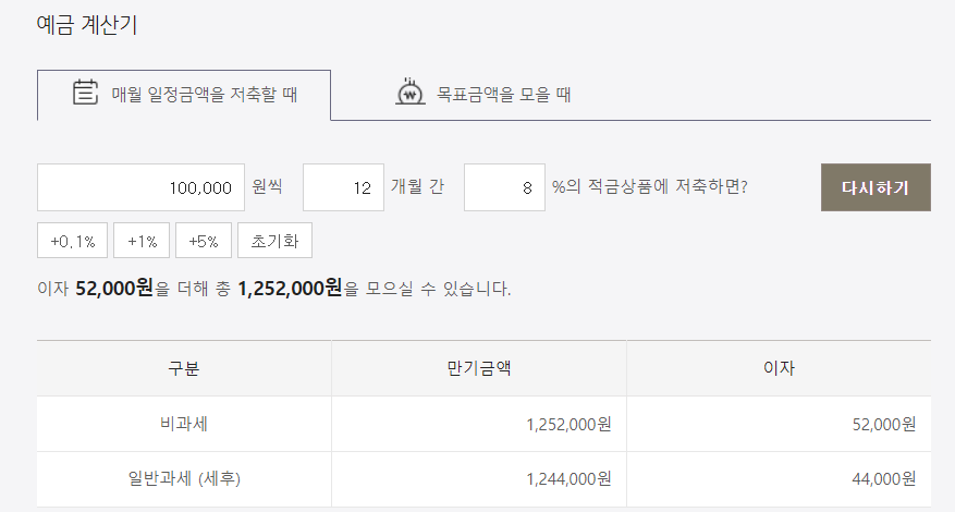 월 10만원씩 적립할 경우, 1년 뒤 원금 1,200,000원 / 이자 52,000원을 더하여, 1,252,000원을 모으실 수 있습니다. 다만, 일반과세에 해당할 경우, 일부 세금 공제 후 수령이 가능합니다.