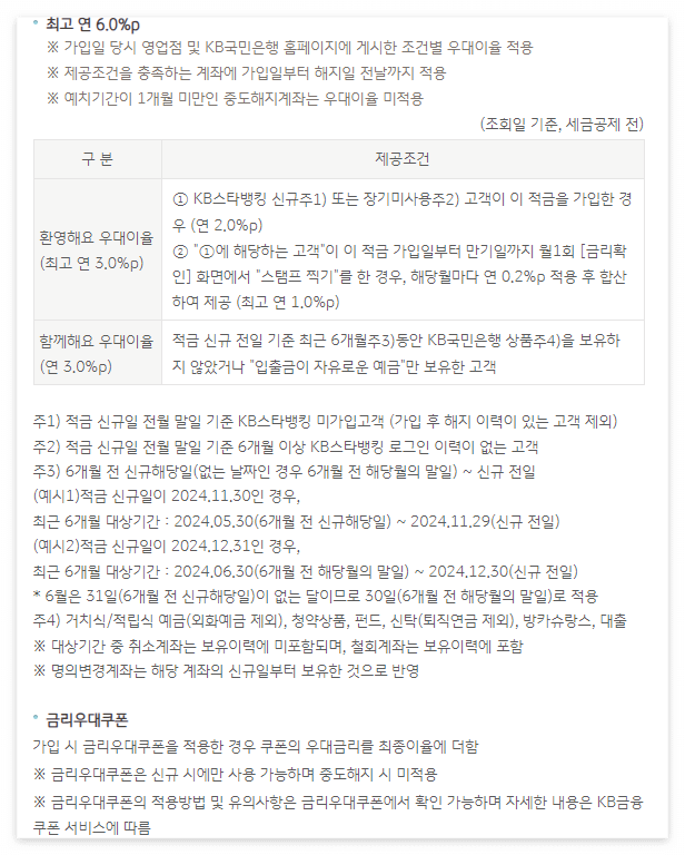 - KB스타뱅킹 신규 고객이 적금 가입 기간 내 '스탬프 찍기'를 한 경우, 월 0.2%p씩 최대 1.0%