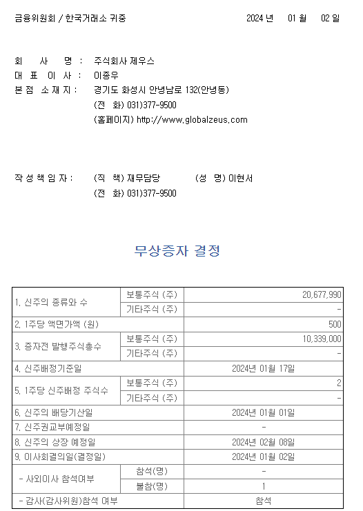 제우스는 지난 1월 2일, 무상증자를 발표했습니다. 이번 무상증자를 통해 주주가치 제고 뿐만 아니라 유통 주식수 확대에 따른 거래 활성화 효도 얻을 수 있을 것으로 보입니다. .