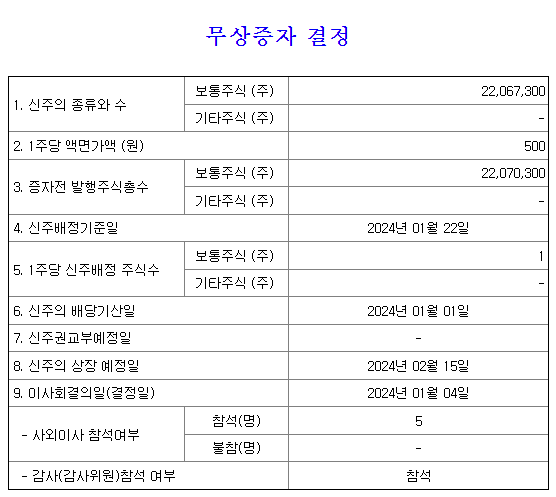 | 제우스 무상증자 200% 결정! (주가, 주주환원, 배당금, 배당일) (0) | 2024.01.05 |
