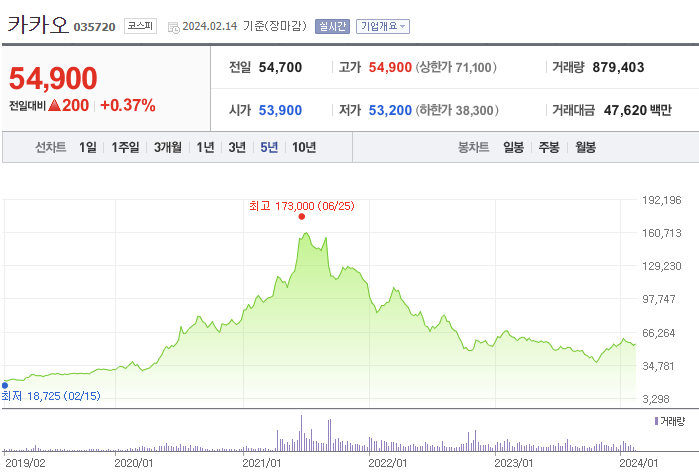 카카오는 지난 팬데믹 기간 전고점인 17만 3천원을 기록하였으나, 이후 지속적으로 하향세를 기록하며 현재는 4~5만원대에서 횡보를 거듭하고 있습니다. 최근에 약간의 상승세가 있었으나, 산재해 있는 이슈들이 많아 주가 상승의 모멘텀이 부족한 상황입니다.